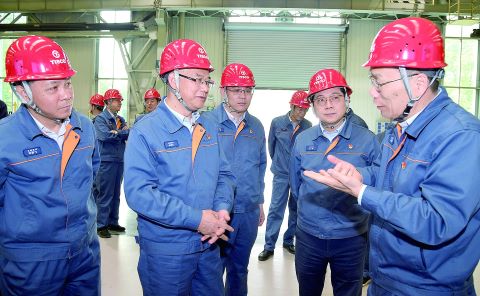 5月12日上午,太鋼集團黨委書記、董事長盛更紅帶領黨委中心組(擴大)成員在精密帶鋼公司重走習近平總書記考察調研之路。 王旭宏攝