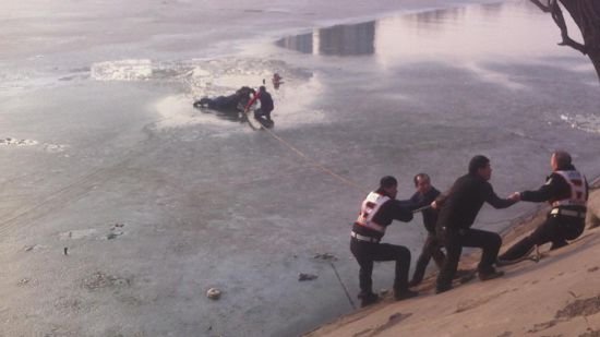 張祺二話不說,扒開池邊鐵絲網就鉆了進去,下了坡岸走上冰面。可是沒邁出兩步冰層就被踩塌了,不會游泳的張祺慌忙從水中爬了起來。正當犯愁時,韓亮田繞過他,從冰面上爬向幼童。眼看就要夠著小男孩,冰面突然破裂。落水瞬間,韓亮田往前一沖緊緊抓住了男孩。在沒過頭頂的水中,他幾次試圖把孩子托上冰面都沒能成功,冰層一次次地碎裂。