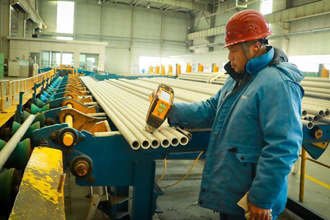 質檢員對不銹鋼管進行質檢。人民網記者 王帆攝