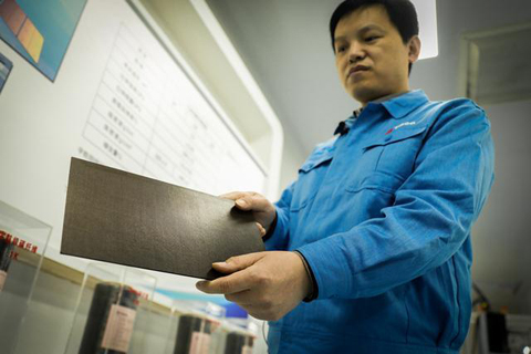 李登華向記者展示碳纖維復合材料板材。人民網記者 王帆攝